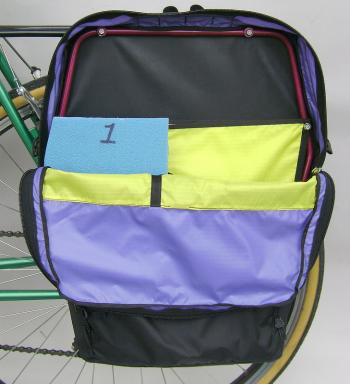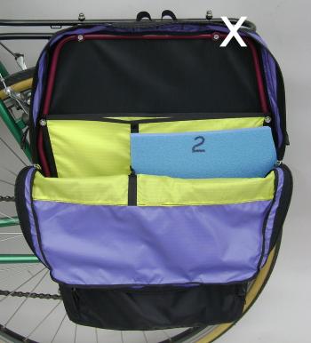 STEP ONE. LATERAL PLACEMENT OF GEAR- It is wise to load a touring bicycle from the rack(s) outward. The narrower the racks are, the better. And the optimum placement of gear on bikes is also in the narrowest position. To optimize gear placement within the panniers that I build I design the inside compartments (those next to the aluminum stiffening plates or internal frames) of panniers to be as narrow as possible. Front panniers have an inner compartment as narrow as 2 in. deep and rear panniers are as narrow as 3 in. deep from the rack outward. Making the panniers narrow ensures that the heaviest and most dense touring gear can be loaded very close to the racks. Gear that is less dense and lighter will be loaded in pockets and compartments that are further away from the racks. As a gear designer, I can optimize the depth of compartments by designing panniers to be taller from top top bottom (18") and wider from front to back (14"), and I do. Experience has taught me that placing gear as closely to the lateral center-line of a bicycle is an essential part of loading a bicycle well.