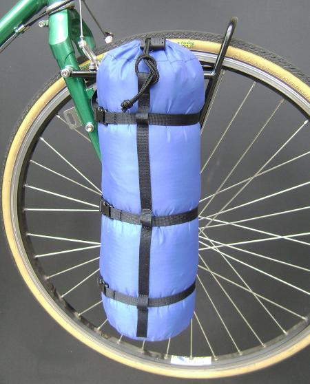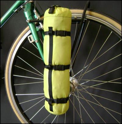 The blue stuff-sack pannier is about 8" in diameter and about as large around as I normally make them. If more carrying capacity is required, I make the panniers longer. This pannier, in terms of its size, is typical of rear panniers, especially when front stuff-sack panniers are not used.