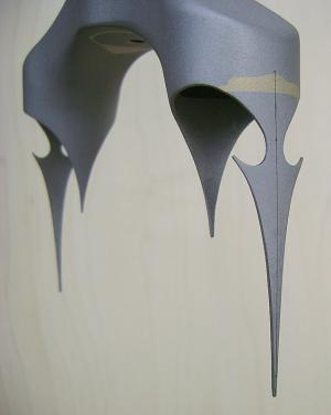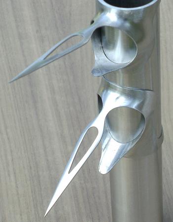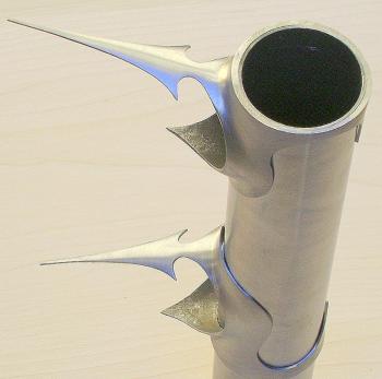 Stylized arrowhead lugs formed from lug add-ons. I\'ve created many types of arrowhead patterns, varying them from frame to frame.